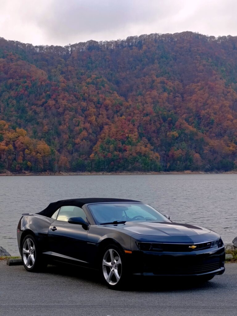 I continued toward Boone, stopping at Blowing Rock for a quick bite near Bass Lake. Then I followed US‑321 to reach Watauga Lake before sunset. I crossed the border from North Carolina back into Tennessee — just a sign, simple but symbolic. I arrived just in time to watch the sun set behind the mountains, captured through my drone. The golden colors reflected on the water, and I took pictures of my car in this magical scenery. It was cold, and very windy, but worth every second.