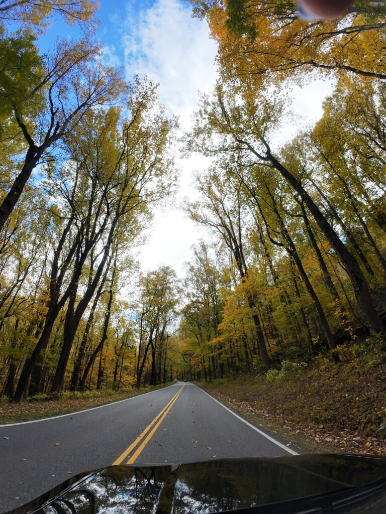 Back on the I‑40 toward Gatlinburg, where I planned to spend the first night. But when I arrived, I still had plenty of time, and there was no way I was going to wait until the next day to enjoy the mountains. I took Little River Gorge Road, a winding road surrounded by golden trees and rivers running alongside the asphalt. I stopped at The Sinks, a waterfall crashing into a deep pool. It felt like all my tension and fear were falling with the water. I let go internally. A few artistic pictures later, I continued toward Fighting Creek Gap Road, mentally and emotionally preparing myself for two days of pure freedom.