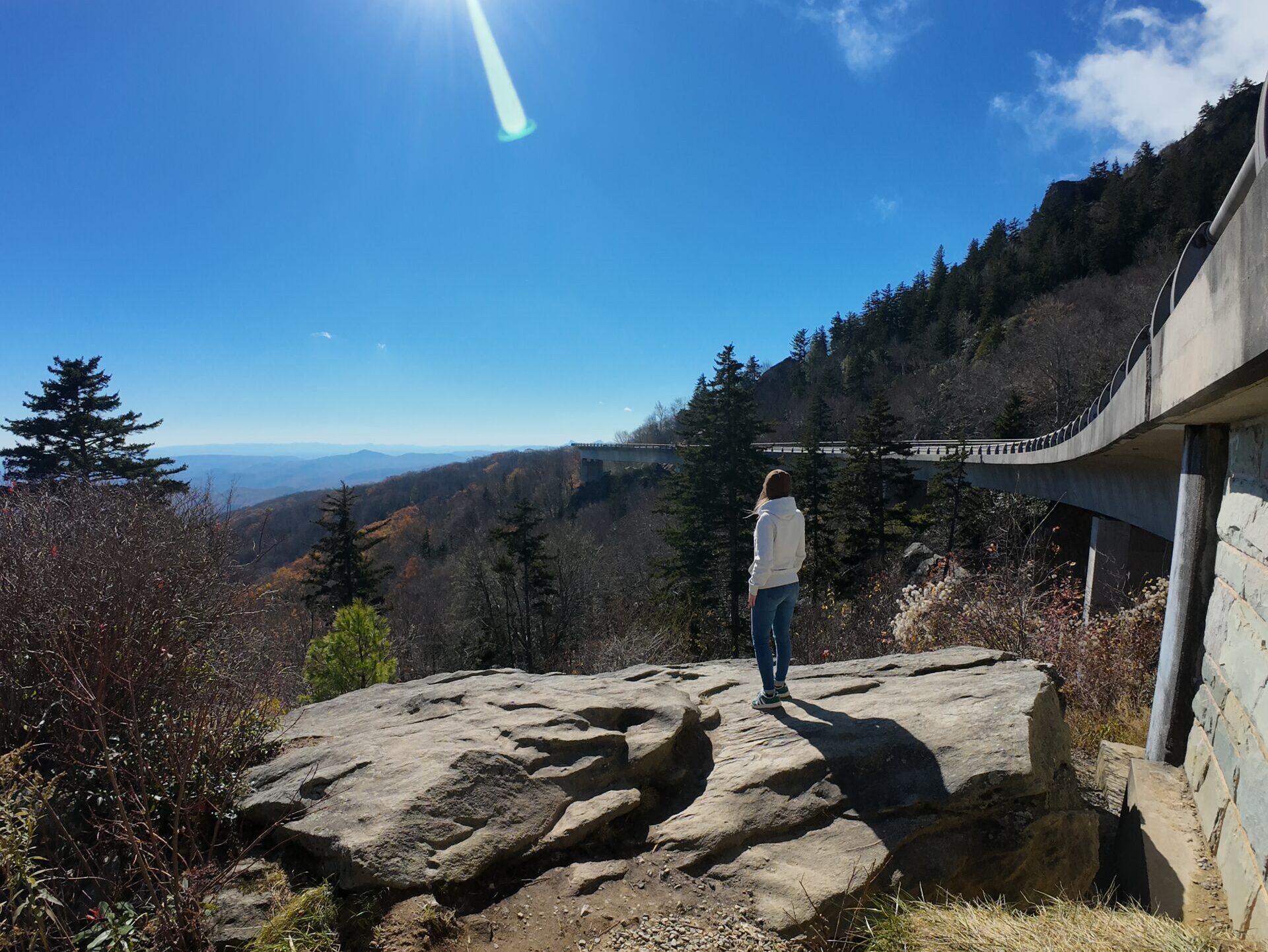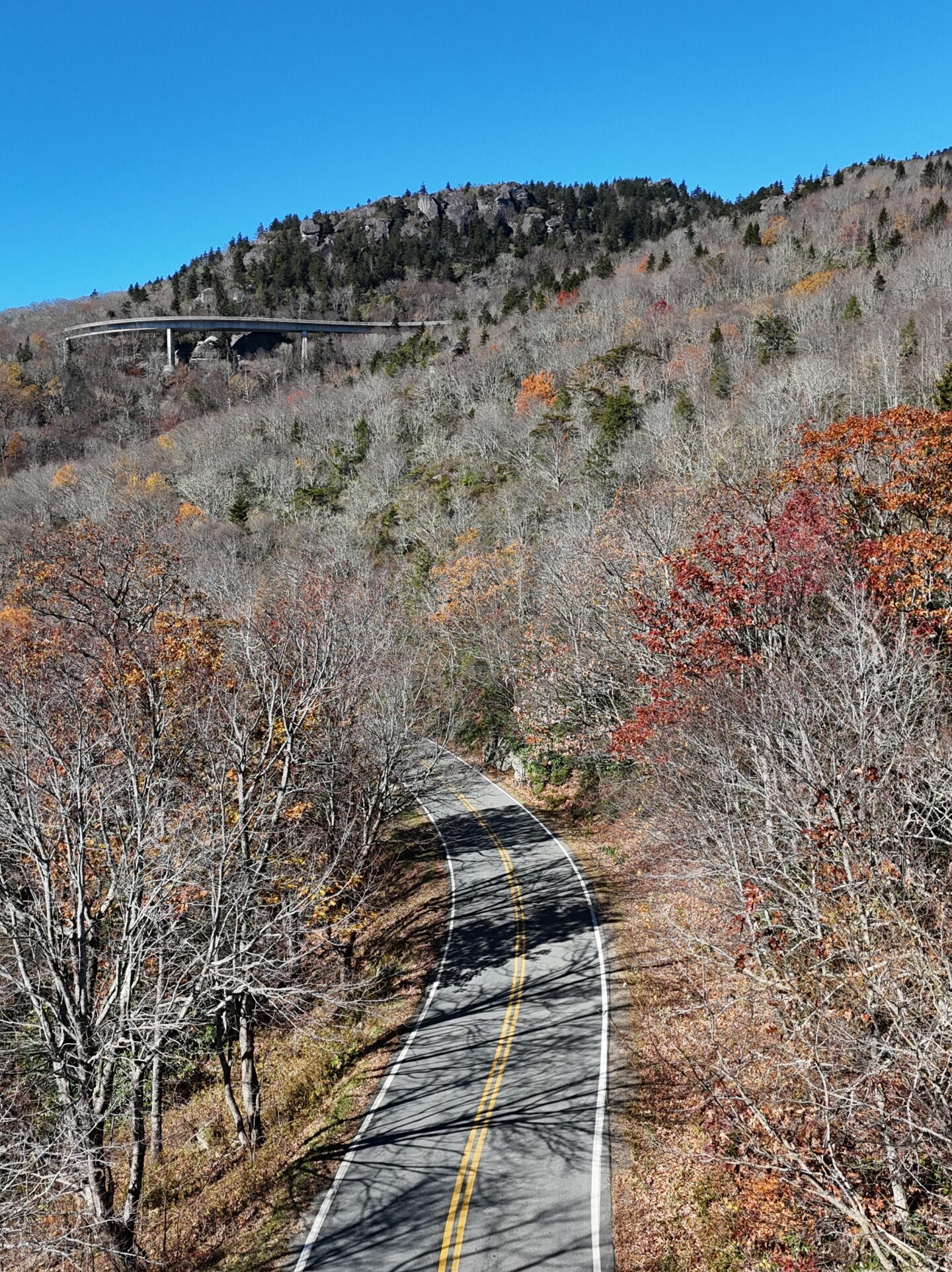 After a good night’s sleep and a calm early morning, I took US‑19E and US‑221 back toward the Blue Ridge Parkway. My goal: the famous Instagram bridge — Linn Cove Viaduct. Honestly, I drove that part back and forth several times, just enjoying the curves and the views. Maybe I was losing time, but I wasn’t here to tick boxes. I was here to feel nature, to reconnect with myself.